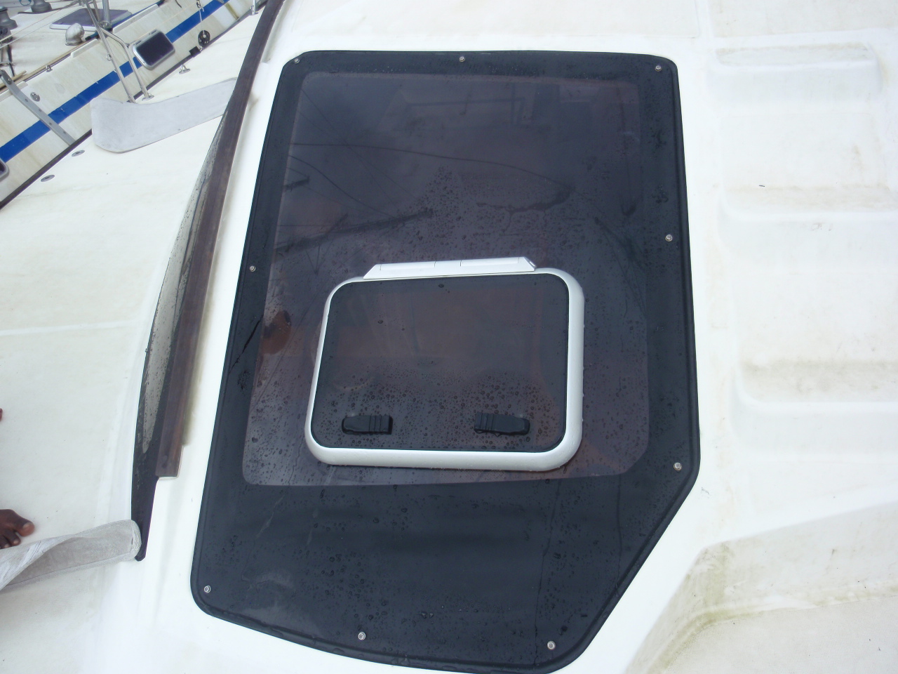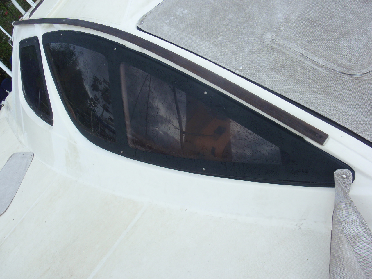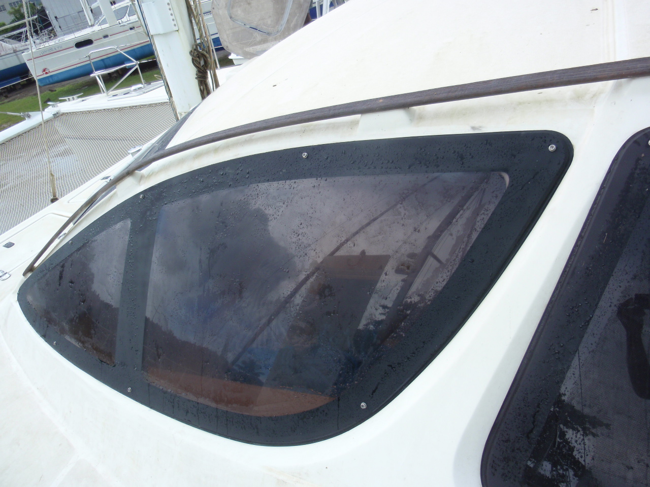 We had a couple major things fixed/redone while on the hard in Trinidad. The biggest issue was after 10 years the plexiglass on the ‘flat’ windows had crazed. It was sorta like looking through broken glass. To add to that, all the flexing in the boat after ‘bashing’ across the Mediterranean and being 10 years old the ‘seals’ around the rest of the plexiglass needed to be redone as well. The flat windows were replaced with new ones, hot drapped and molded to fit their spots and the large tear drop windows resealed and the surround repainted. There were 2 other leaks that were identified and fixed as well, one in the owners shower and one in the starboard engine compartment where the seat / hull were joined, these were also sealed, with any luck all we’ll stay drier on the inside now.