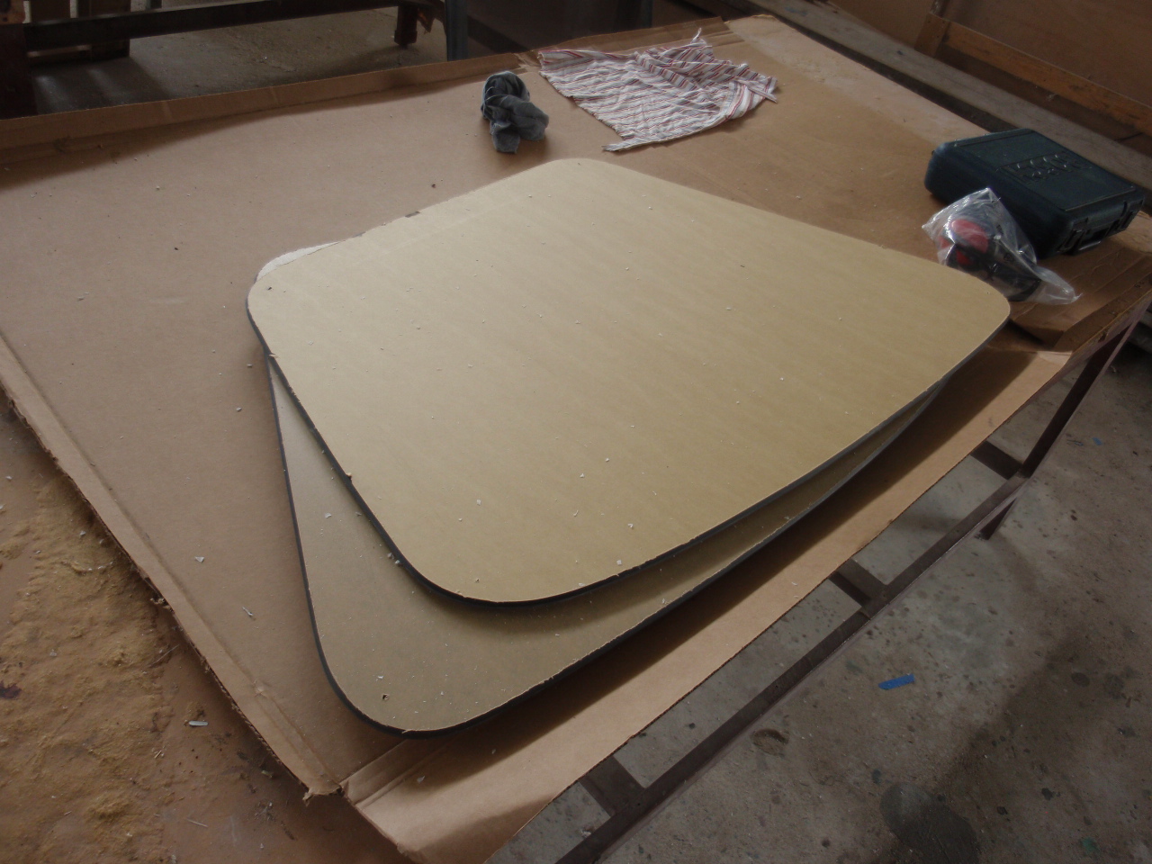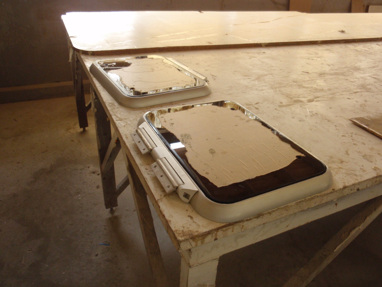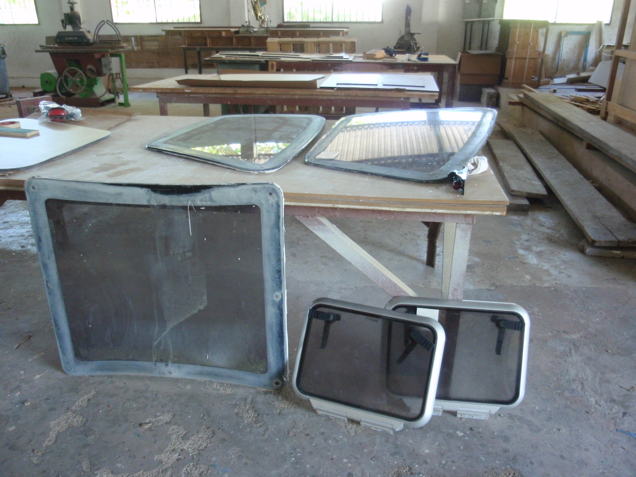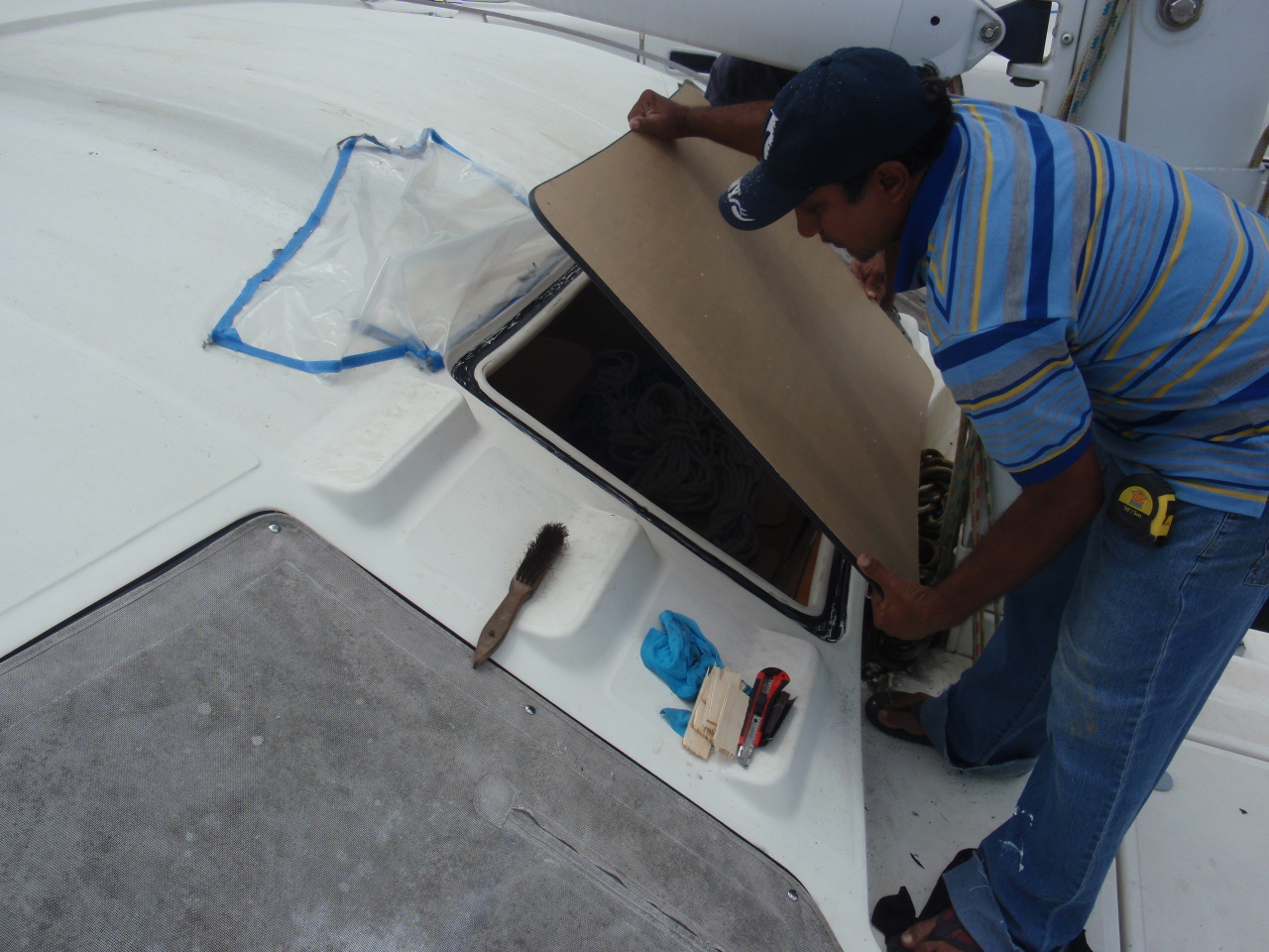 We had a couple major things fixed/redone while on the hard in Trinidad. The biggest issue was after 10 years the plexiglass on the ‘flat’ windows had crazed. It was sorta like looking through broken glass. To add to that, all the flexing in the boat after ‘bashing’ across the Mediterranean and being 10 years old the ‘seals’ around the rest of the plexiglass needed to be redone as well. The flat windows were replaced with new ones, hot drapped and molded to fit their spots and the large tear drop windows resealed and the surround repainted. There were 2 other leaks that were identified and fixed as well, one in the owners shower and one in the starboard engine compartment where the seat / hull were joined, these were also sealed, with any luck all we’ll stay drier on the inside now.