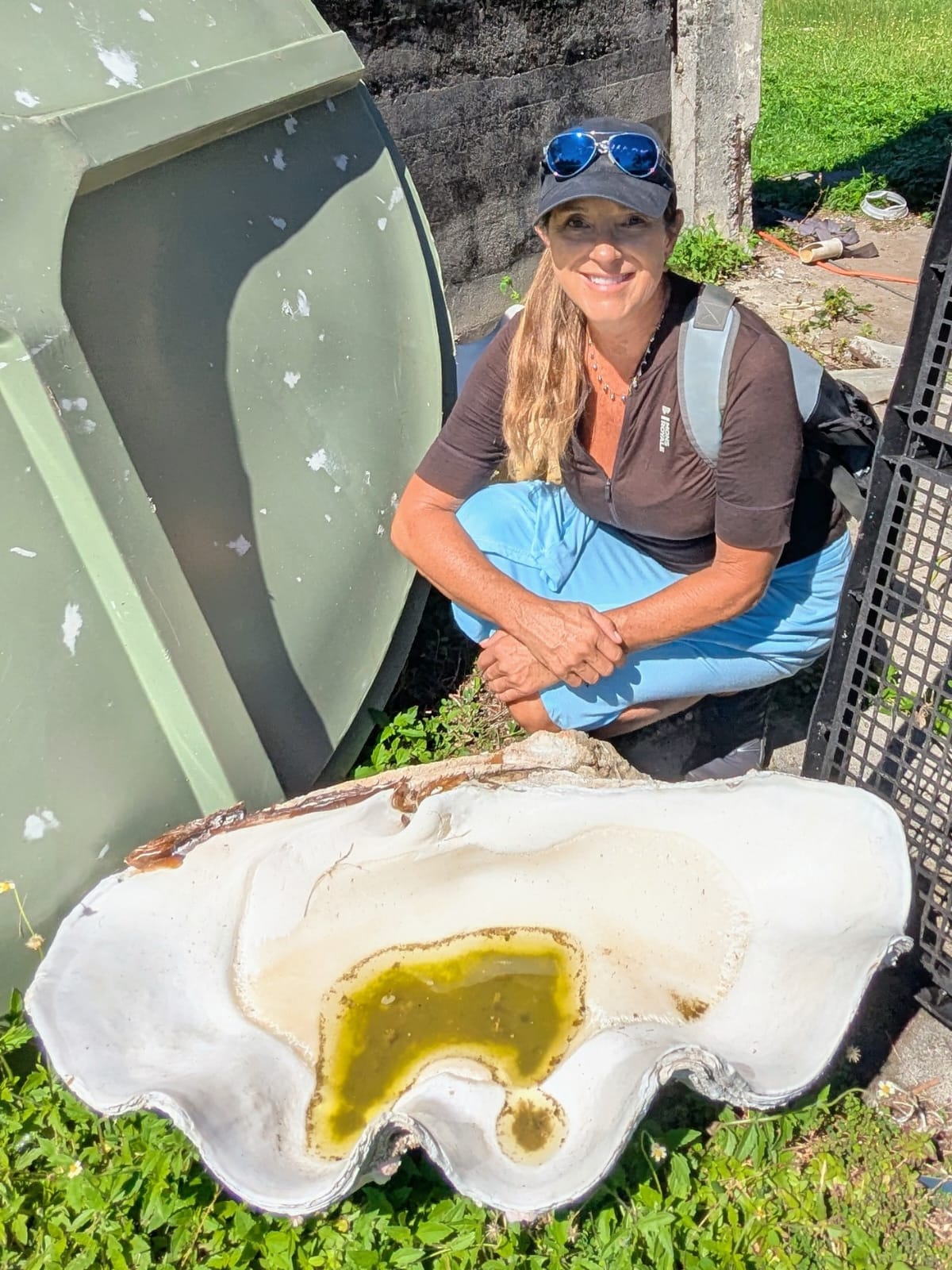 There was one giant clam in the shallows. It was probably 4′ across and 2.5′ deep. It is next to a very large tractor tire (not a car tire).