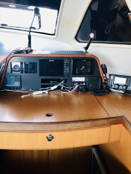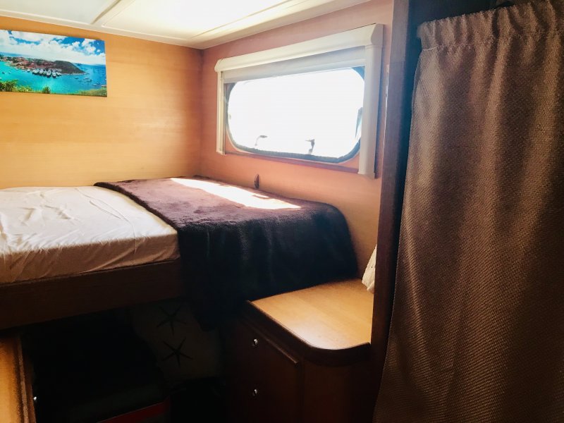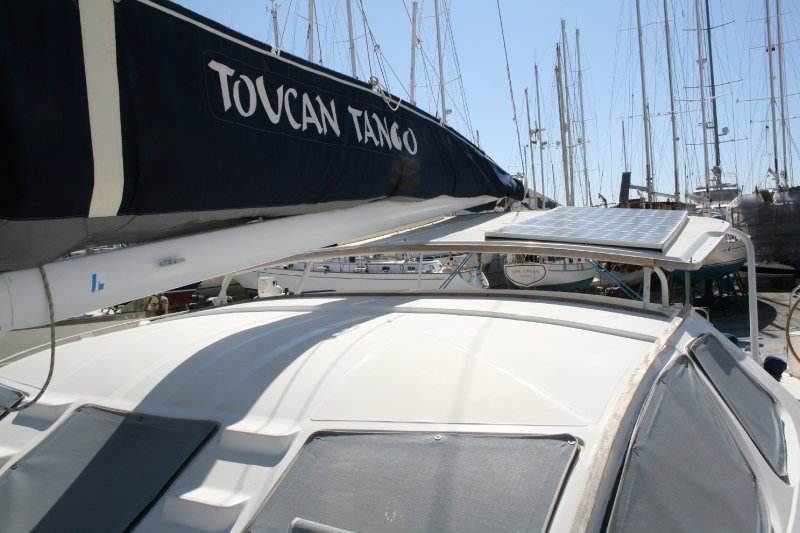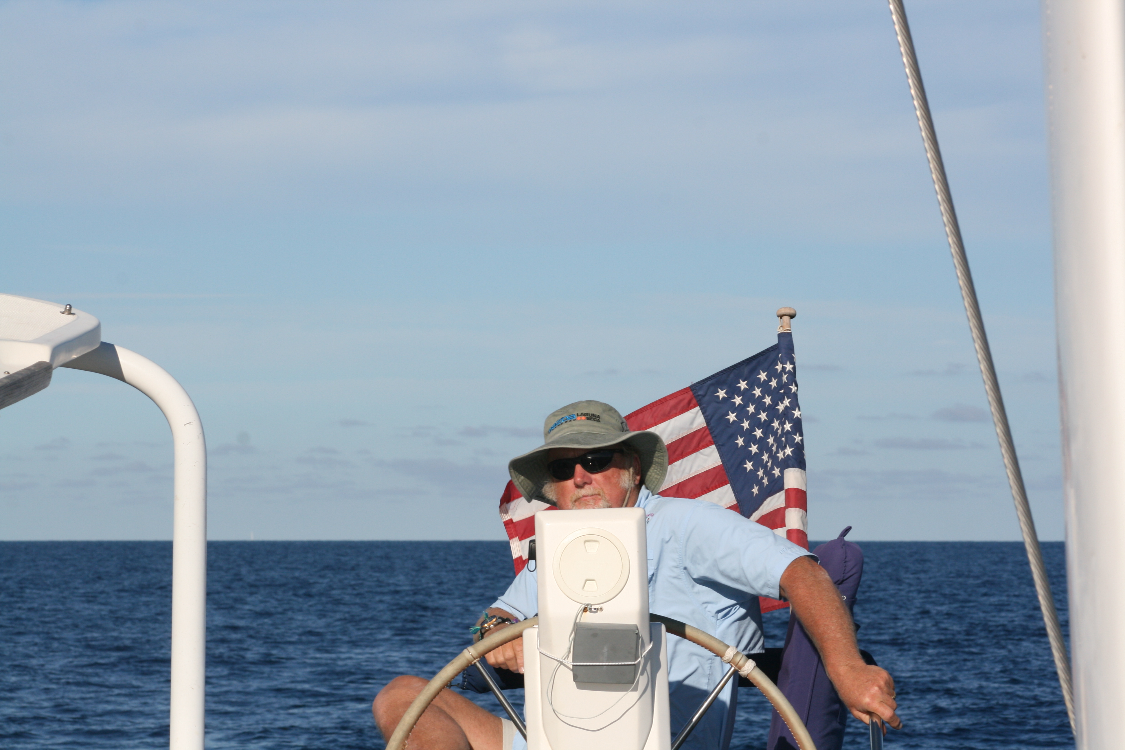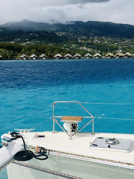 We both jump in the water and take several hours to burnish the Coppercoat. We have not had to do anything to the bottom since we splashed which was 7 weeks ago. I do the “easy” part which is cleaning the sides of the hulls (4 sides x 50′ is a lot to cover) as far as I can go while holding my beath. Matt does the hard part (clean the very bottom) using the hooka. I have far more area to cover but he works upside down.